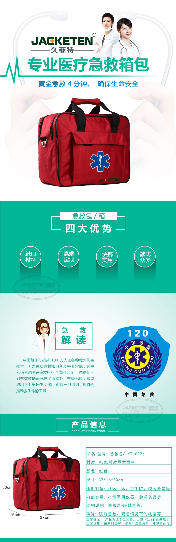 品名/貨號:急救包/JKT-002;材質(zhì):900D股質(zhì)尼龍面料;顏色:紅色;尺寸:37*16*30cm;適用對象:社區(qū)門診、衛(wèi)生院、校醫(yī)務室等;內(nèi)部容量:小型醫(yī)用儀器、急救藥品等;結(jié)構(gòu)說明:器械層+耗材層;功能:院前急救、緊急情況下的救援等
